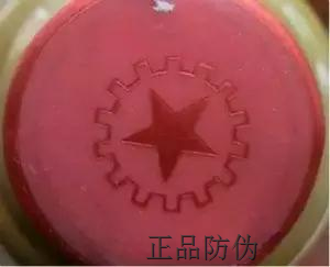 头套顶部印有齿轮圈五星图案。主要看齿轮笔画的线条粗细与空格的比例。图案用稍有点光度的红色油漆印刷。五角星的大小比例协调,其中有一个尖角对准圆圈齿轮的一个空格,对着空格的正中间。